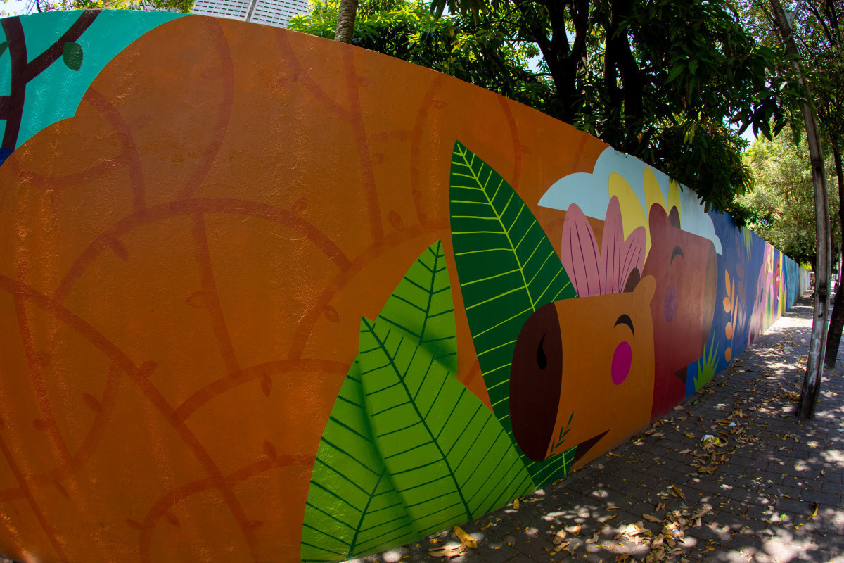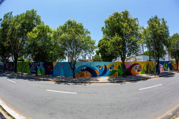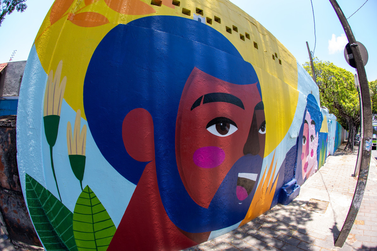 Criado por Marquinhos ATG, referência na cena de arte urbana pernambucana, o mural tem 200 metros de extensão e ocupa o muro da escola Liceu Nóbrega e o estacionamento em frente à Unicap