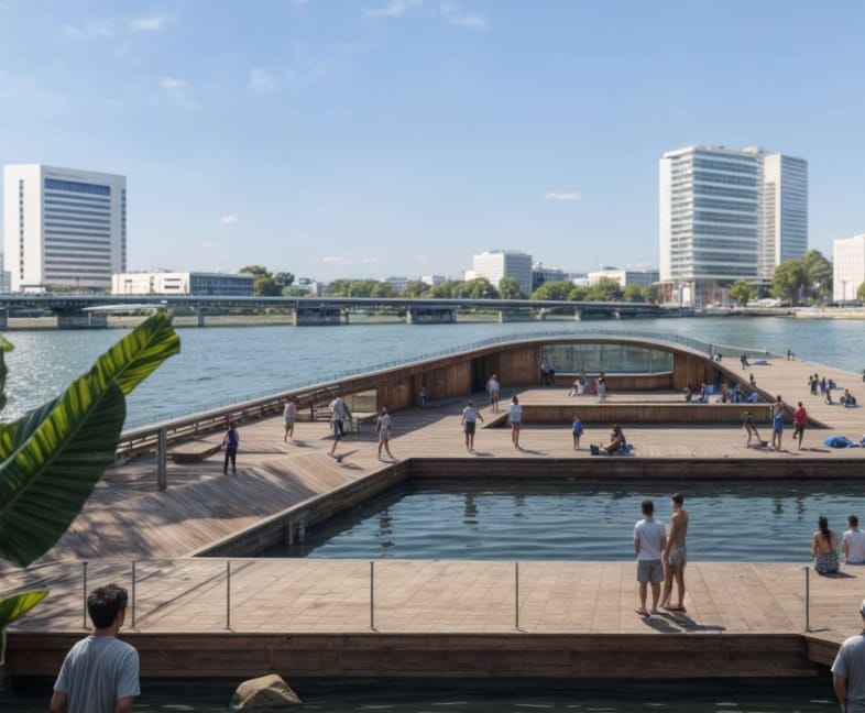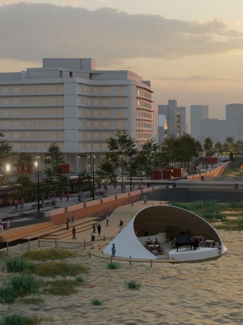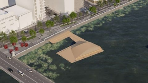 A sugestão inclui ainda um palco flutuante, que corresponde a uma estrutura de madeira sobre o rio, com o objetivo de receber apresentações musicais e artísticas. Com a presença de um bar ou restaurante, o equipamento, assim como o deck, terá seu desenho arquitetônico definido por aqueles “que irão garantir sua viabilidade econômica e financeira”.