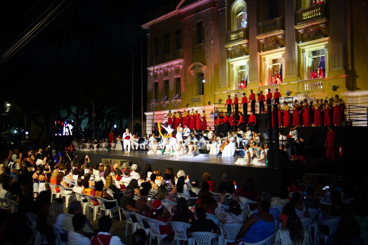 O público, reunido diante do Palácio do Campo das Princesas, assistiu gratuitamente ao espetáculo que celebra o fim do ano e o espírito de fraternidade, em parceria com o governo de Pernambuco e o Instituto Ricardo Brennand.