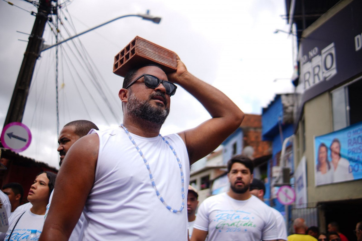 Com tijolos na cabeça, fiéis sobem o Morro da Conceição para agradecer por casa própria