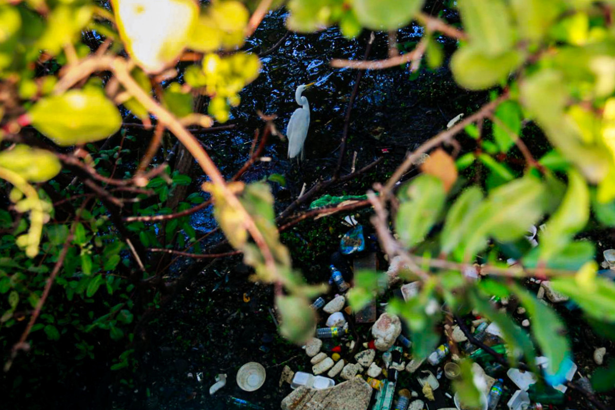 Garça divide espaço com o lixo acumulado às margens do Capibaribe. (Foto: Crysli Viana/DP Foto)