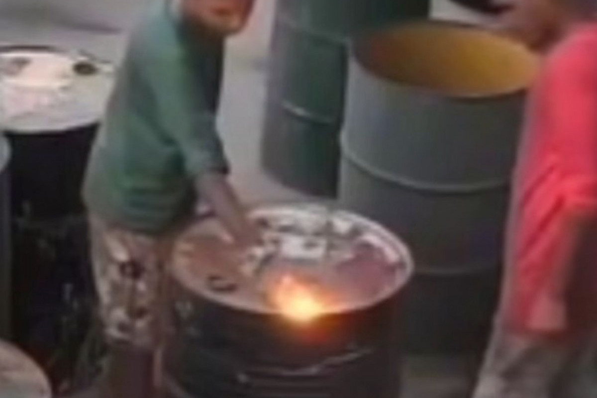 Enquanto isso, o outro jovem acende um isqueiro repetidas vezes e se aproxima de um terceiro barril. Em seguida, ele introduz o braço no interior do recipiente e tenta atear fogo. Logo depois, volta a acender o isqueiro na parte inferior do tonel que havia sido perfurado.