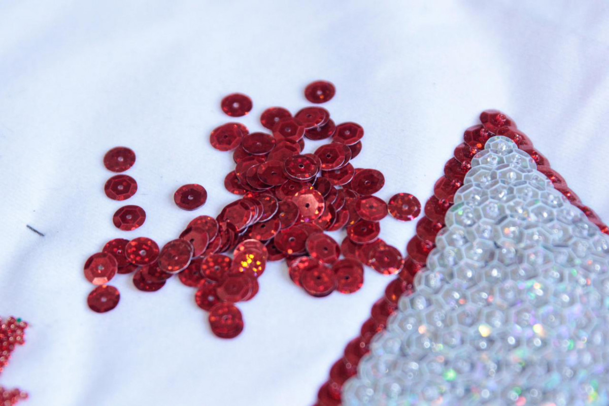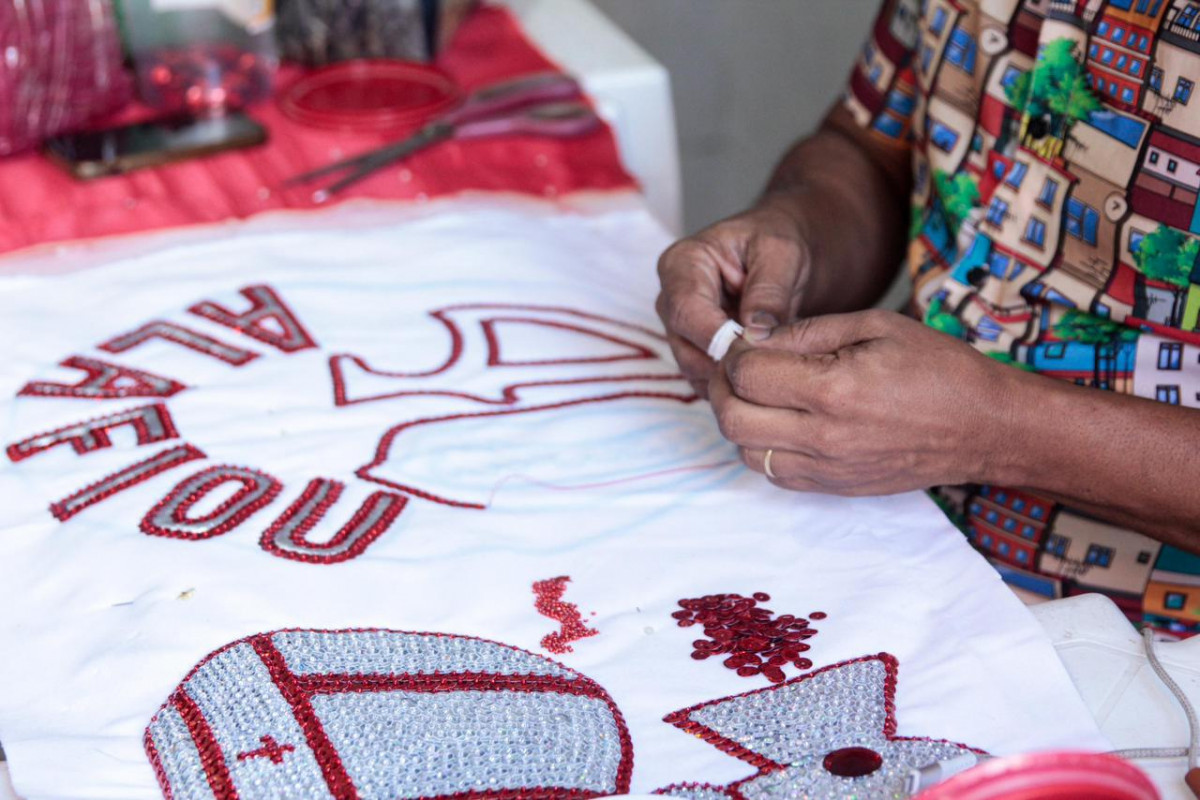 “A gente começou a confeccionar as roupas em agosto e mesmo assim leva tempo. Todos os dias são três pessoas que vêm aqui para fazer este trabalho. Em alguns momentos chega a ter mais gente, mas todos os dias no batente são apenas três. Tudo é feito aqui, o pessoal chega do trabalho e já vem para cá para bordar”, conta Ceça, enquanto mostra os dedos marcados pela prática constante de colar lantejoulas.