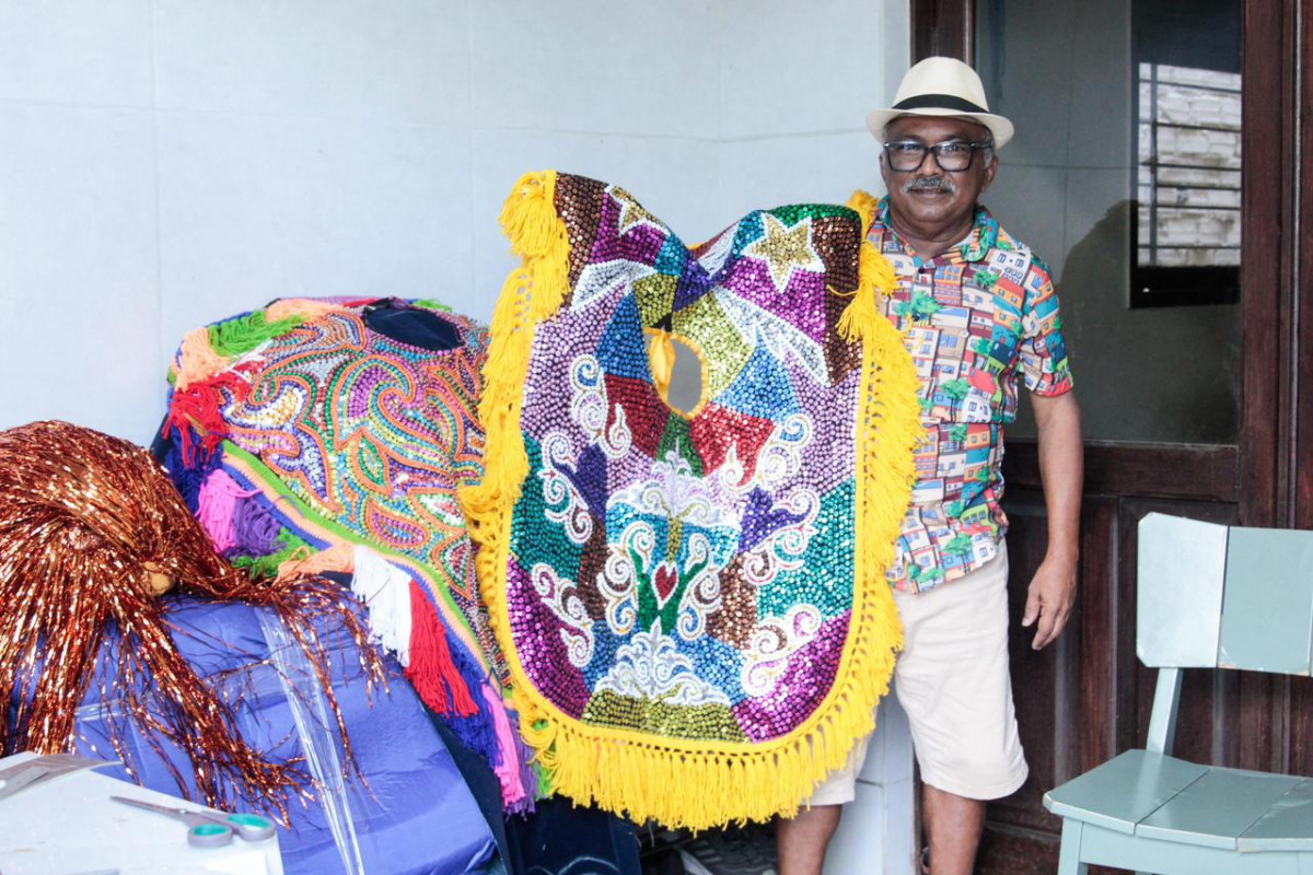 Filho do Mestre Salustiano, fundador da Associação de Maracatus de Baque Solto, Manoel Salustiano atualmente trabalha bordando estandartes para diversos maracatus. “Meu pai foi um dos lutadores por essa cultura do Maracatu de Baque Solto. Então, a gente já nasce dentro da cultura. Eu comecei a me envolver mesmo a partir dos 14 anos. Nem sempre eu trabalhei confeccionando. Eu comecei dançando no maracatu. Mas essa coisa de ser artesão carnavalesco me chamou atenção porque ele sempre foi invisível. Geralmente quem dá entrevista é quem está no palco, quem está dançando”, relata.