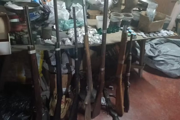 No local, foram apreendidos uma arma de fogo industrial, nove armas de fabricação artesanal, cerca de 550 quilos de pólvora, além de espoletas e diversos materiais utilizados na fabricação de munições de diferentes calibres, conforme registrado no boletim de ocorrência. No local também havia dois homens trabalhando com máquinas para perfurar rocha.