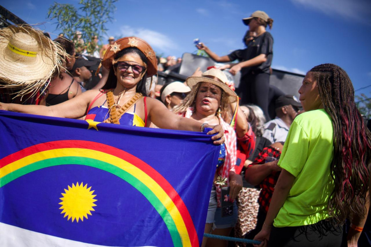 “Eu amo carnaval e amo São João”, afirmou a cuidadora Elisangela Vasconcelos, 53. Ela, que estava vestida de cangaceira com a bandeira de Pernambuco, disse que acabou ficando gripada após a folia de momo, mas isso não a impediu de marcar presença na Drilha de João Gomes, de quem ela diz ser fã.