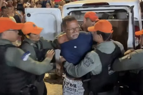 Em seguida, o mesmo PM retira a placa que mostrava os preços de bebidas, pega o vendedor pelos braços e joga ele no chão. Nesse momento, outros policiais, entre homens e mulheres, aparecem na cena. O comerciante é arrastado, com as mãos presas atrás do corpo, entre as pessoas que estavam na festa.