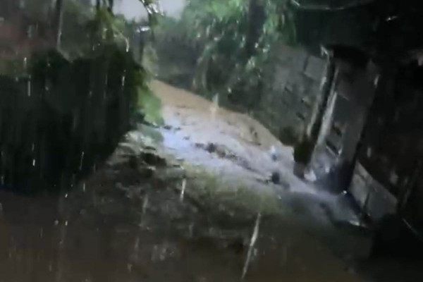 Vídeos que circulam nas redes sociais mostram o momento em que um grande volume de água desce por uma barreira, passando por residências e evidenciando o risco provocado pela saturação do solo.