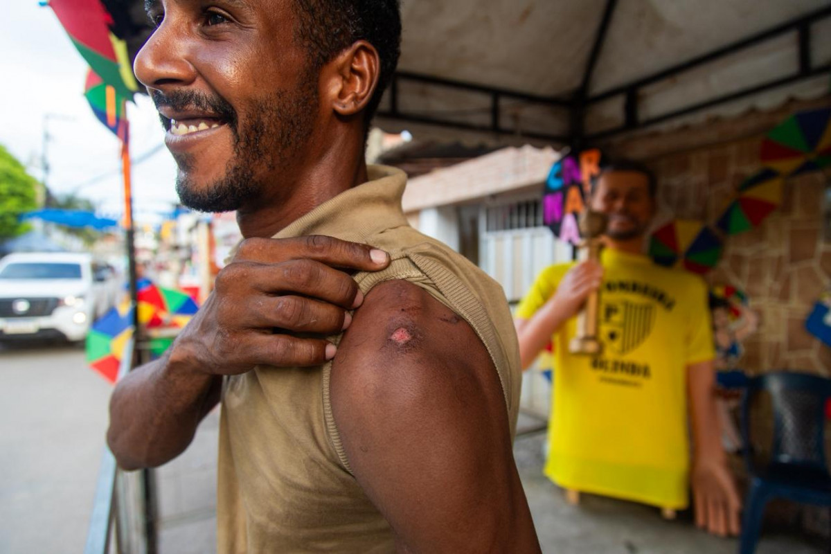 O serralheiro Wendel Galdino da Silva Barros, de 34 anos, mostra um ferimento no ombro esquerdo enquanto abre um sorriso largo. Parece doer. Na segunda-feira de carnaval, carregou o boneco gigante do ator Wagner Moura, o mais cobiçado neste ano, por três horas e meia, daí o machucado. “Carnaval pra mim é felicidade”, resume.